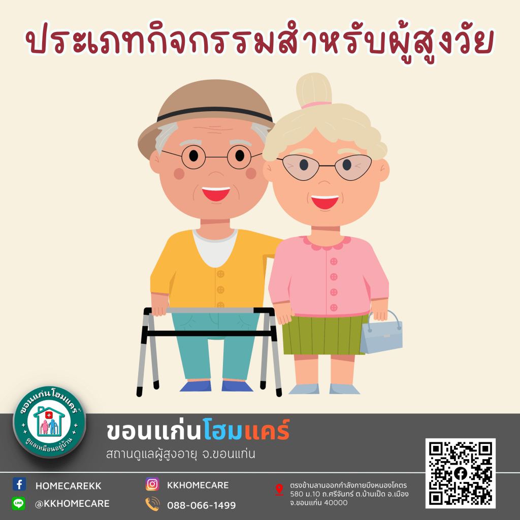 กิจกรรมสำหรับผู้สูงวัยประกอบด้วยกิจกรรมที่ส่งเสริมสุขภาพทางกาย และกิจกรรมส่งเสริมสุขภาพทางใจและสังคม