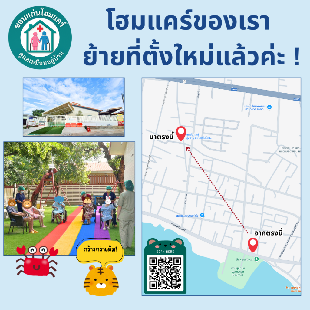 ที่อยู่ใหม่ของเราเดินทางสะดวกขึ้น บรรยากาศเงียบสงบ และเรายังคงมาตรฐานการดูแลเหมือนเดิมทุกประการ เพื่อให้คนที่คุณรักได้รับการดูแลอย่างดีที่สุดเหมือนเดิมค่ะ